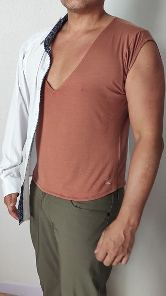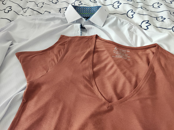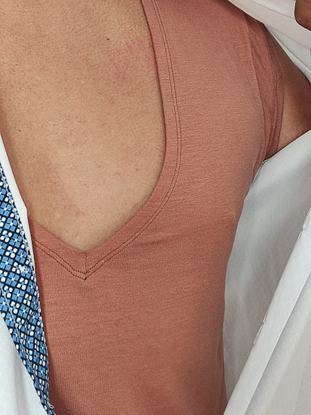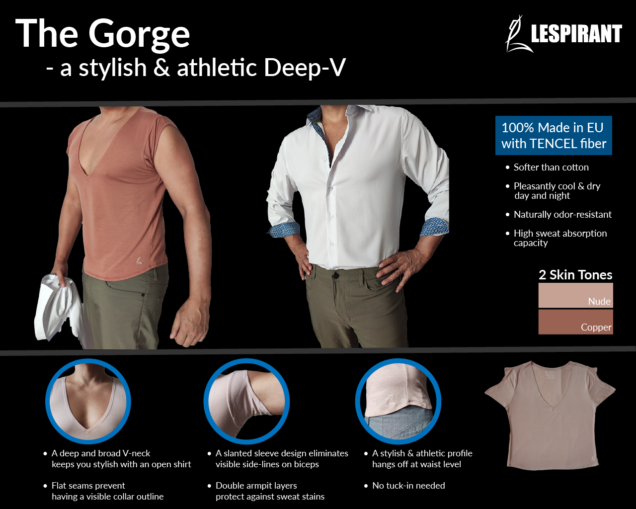 The Gorge comes in 2 skin tones (nude and copper) to further ensure that it will stay invisible even under a thin white shirt. Unlike traditional undershirt, they will never turn yellow!